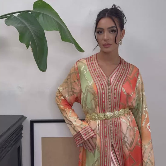 Caftan marocain en tissu satiné traditionnel aux dégradés élégants de orange corail et vert pistache, entièrement brodé à la main selon la technique artisanale du Tarz Maalem. Cette broderie fine, réalisée en fil doré, incarne le savoir-faire des maîtres artisans marocains et apporte un éclat royal à la tenue.