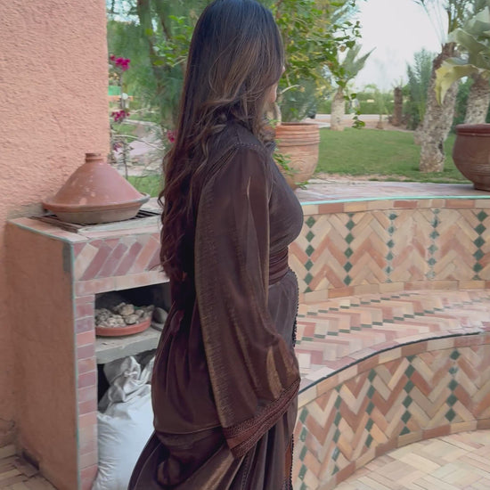Succombez à l'élégance de ce caftan en satin chocolat, au tombé fluide et lumineux. Sa coupe traditionnelle, cintrée par une ceinture assortie, sublime la silhouette avec raffinement. Parfait pour mariages, fiançailles ou henné.